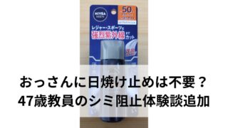 47歳教員のシミ対策体験談!「おっさんに日焼け止めは不要」と思っていた脂性肌・汗っかきの筆者が、ニベアメン UVプロテクトジェルでシミを阻止できた理由とは?メラノCCとのセット使いで、こめかみのシミに変化が。一年中屋外授業がある先生、必見です!